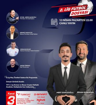 Mert Dokuzoğlu'nun sunumu, Erhan Kuşkapan'ın yorumuyla 2.lig futbol dosyası canlı yayınla Pazartesi saat 22'de Kanal 3'te