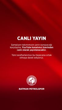 Batman Petrolspor resmi Instagram hesabı ; Şampiyon takımımızın maçını YouTube kanalımız üzerinden yayınlanacaktır.Tüm taraftarları bu heyecana ortak olmaya davet ediyoruz; diye çağrıda bulundu.